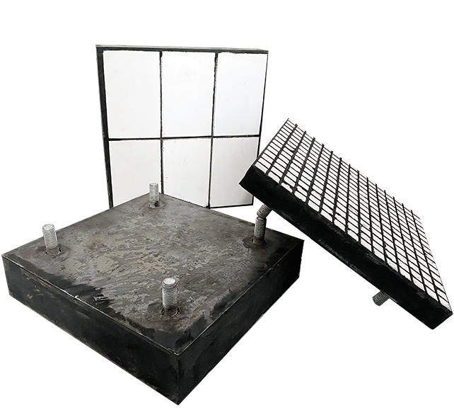 即陶瓷和橡膠三合一板,將特殊的陶瓷片通過硫化工藝嵌入特種橡膠內(nèi),形成方形的耐磨橡膠陶瓷復(fù)合體,然后通過焊接或粘貼固定在設(shè)備的內(nèi)殼鋼板上,以形成堅固而緩沖的耐磨層。